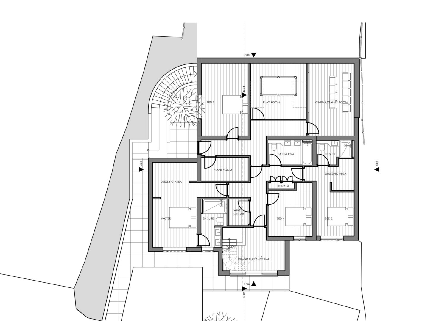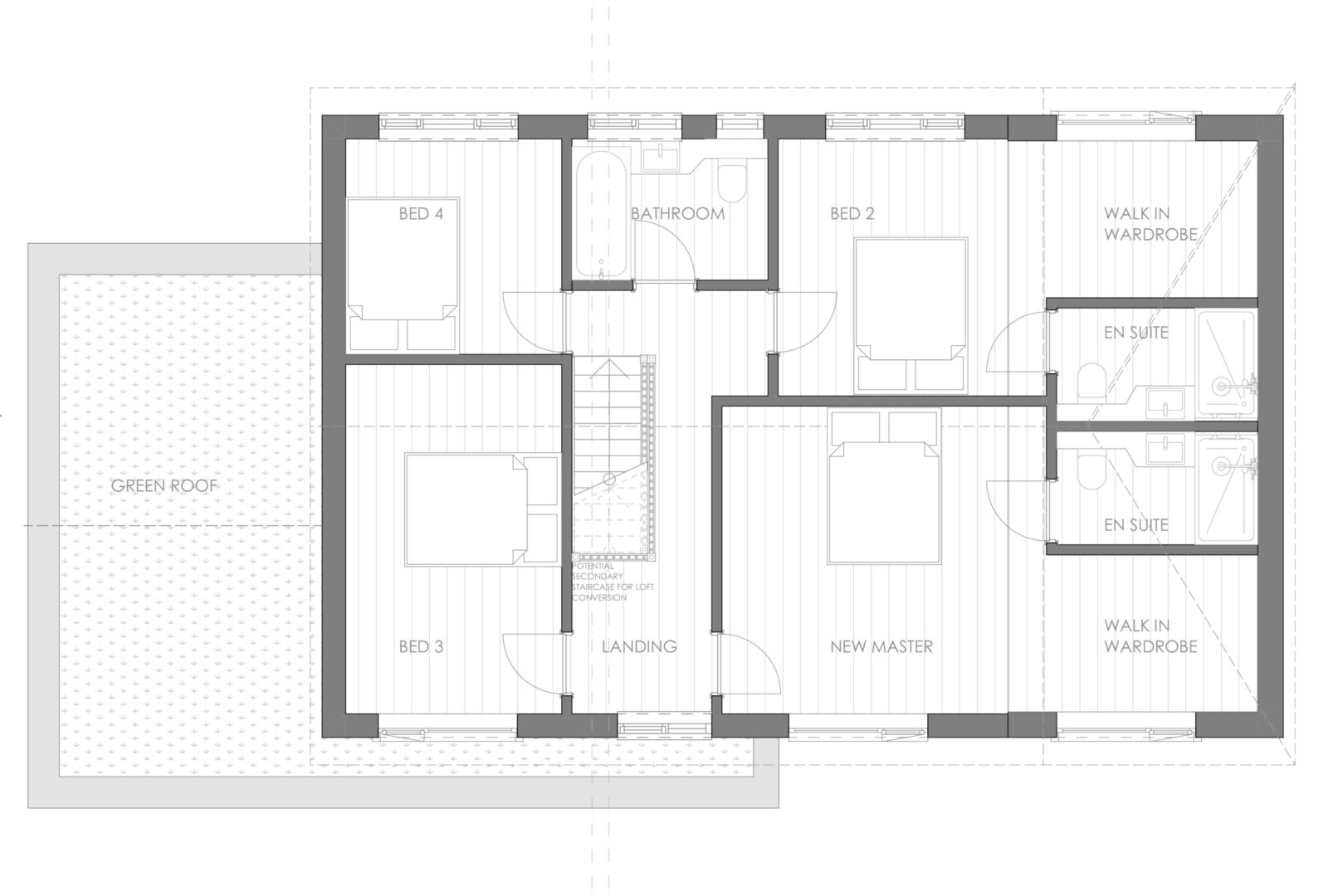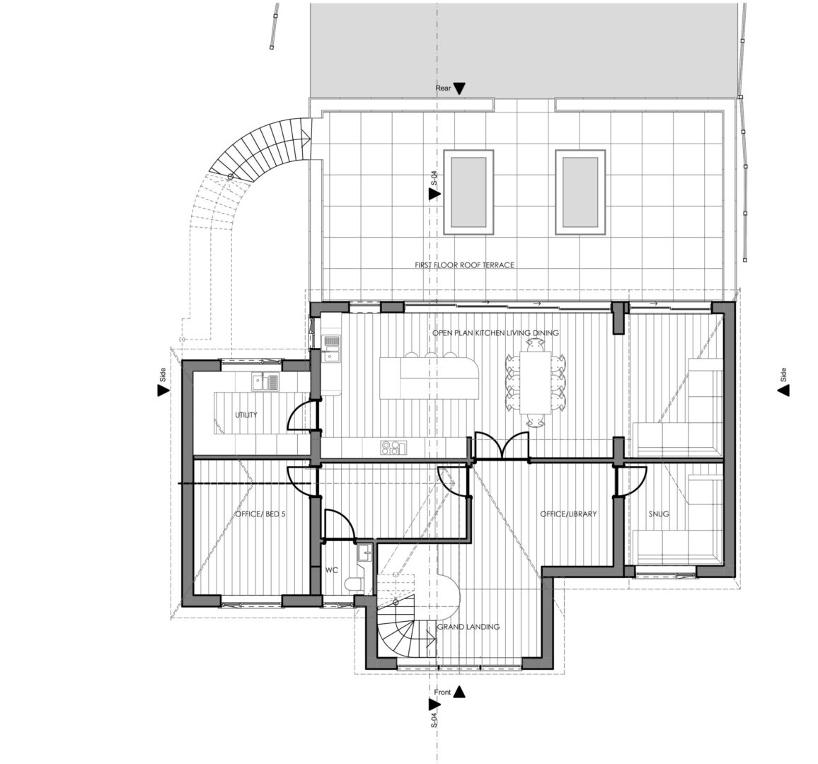 Option 1 was designed to be an upside-down house, with sleeping quarters at ground floor level and living spaces on the first floor. This scheme takes advantage of the topography of the site by building into the rear garden and using the roof of the single-story extension to complete a direct access onto the relandscaped garden. Creating a seamless indoor-outdoor transition from the living area. A new dominant gable has been added to the front elevation creating a focal point on the grand entrance. It also houses the impressive open office library and hall which provides views back out across the valley like terrain of Kingsland. The remaining rooms at the front of the home, include ancillary quiet spaces which could be used as guest bedrooms or offices.