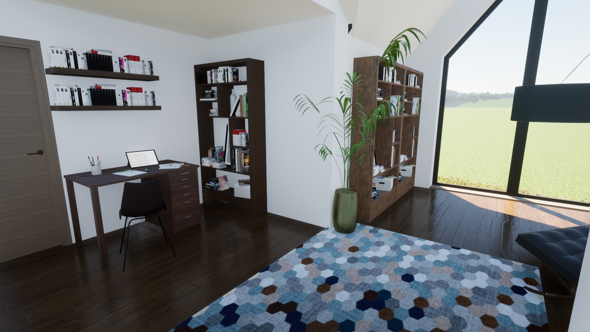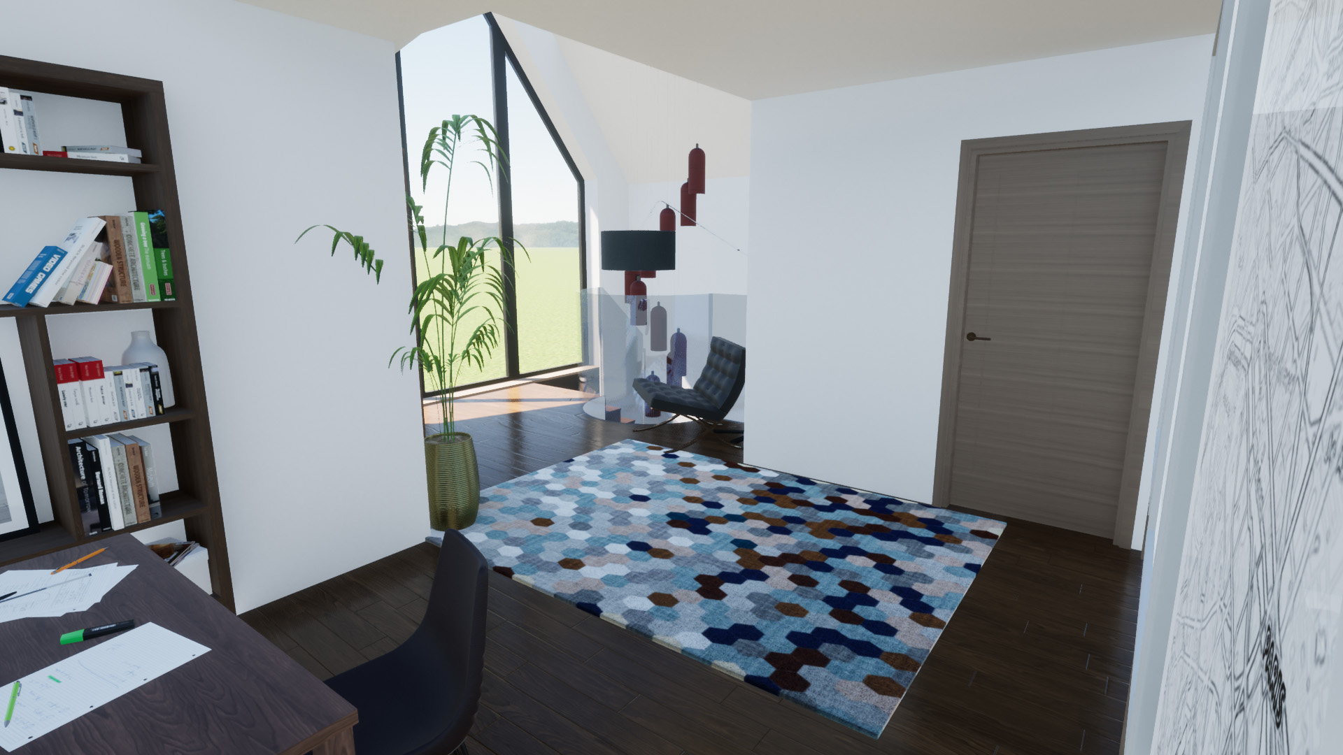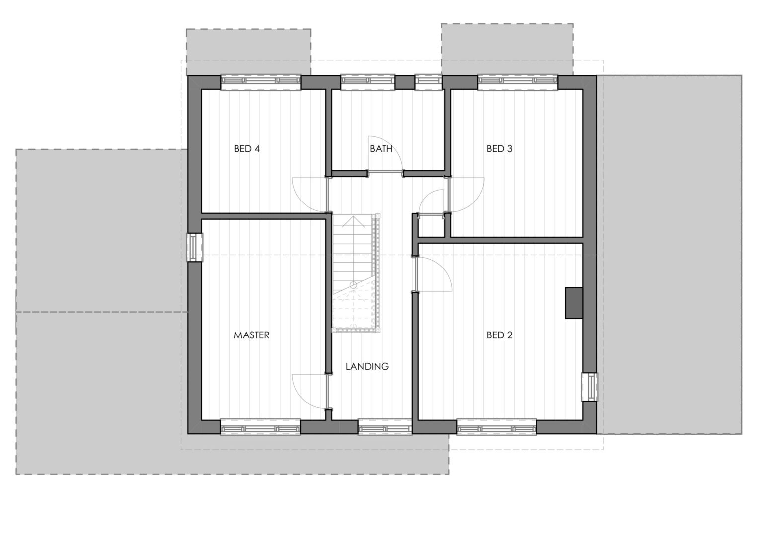 Option 1 was designed to be an upside-down house, with sleeping quarters at ground floor level and living spaces on the first floor. This scheme takes advantage of the topography of the site by building into the rear garden and using the roof of the single-story extension to complete a direct access onto the relandscaped garden. Creating a seamless indoor-outdoor transition from the living area. A new dominant gable has been added to the front elevation creating a focal point on the grand entrance. It also houses the impressive open office library and hall which provides views back out across the valley like terrain of Kingsland. The remaining rooms at the front of the home, include ancillary quiet spaces which could be used as guest bedrooms or offices.